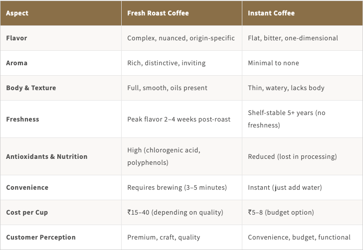 Fresh roast captures origin characteristics (terroir, altitude, processing). Instant coffee is pre-brewed and concentrated—all nuance lost. You taste the roasting process, not the coffee.